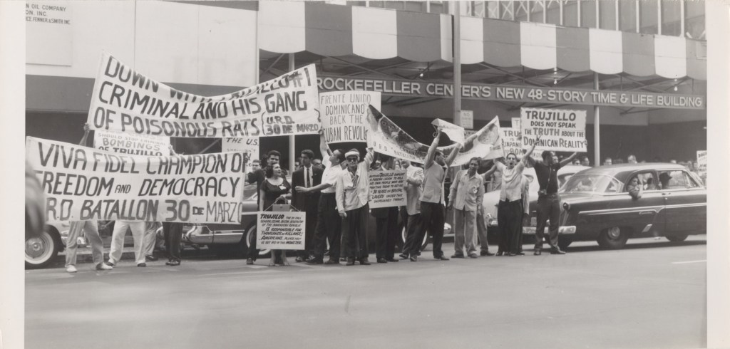 Working as a studio photographer as well as for New York’s principal Spanish-language newspaper, El Diario La Prensa, Cuban American photographer Justo A. Martí (1920–1990) documented the city in an era when Puerto Ricans and other Latinx people were arriving in the city in record numbers. His rich archive includes scenes of Fidel Castro in New York, parades and beauty pageants, and this early image of protest, a demonstration against the dictator Rafael Trujillo held by Dominicans in New York.