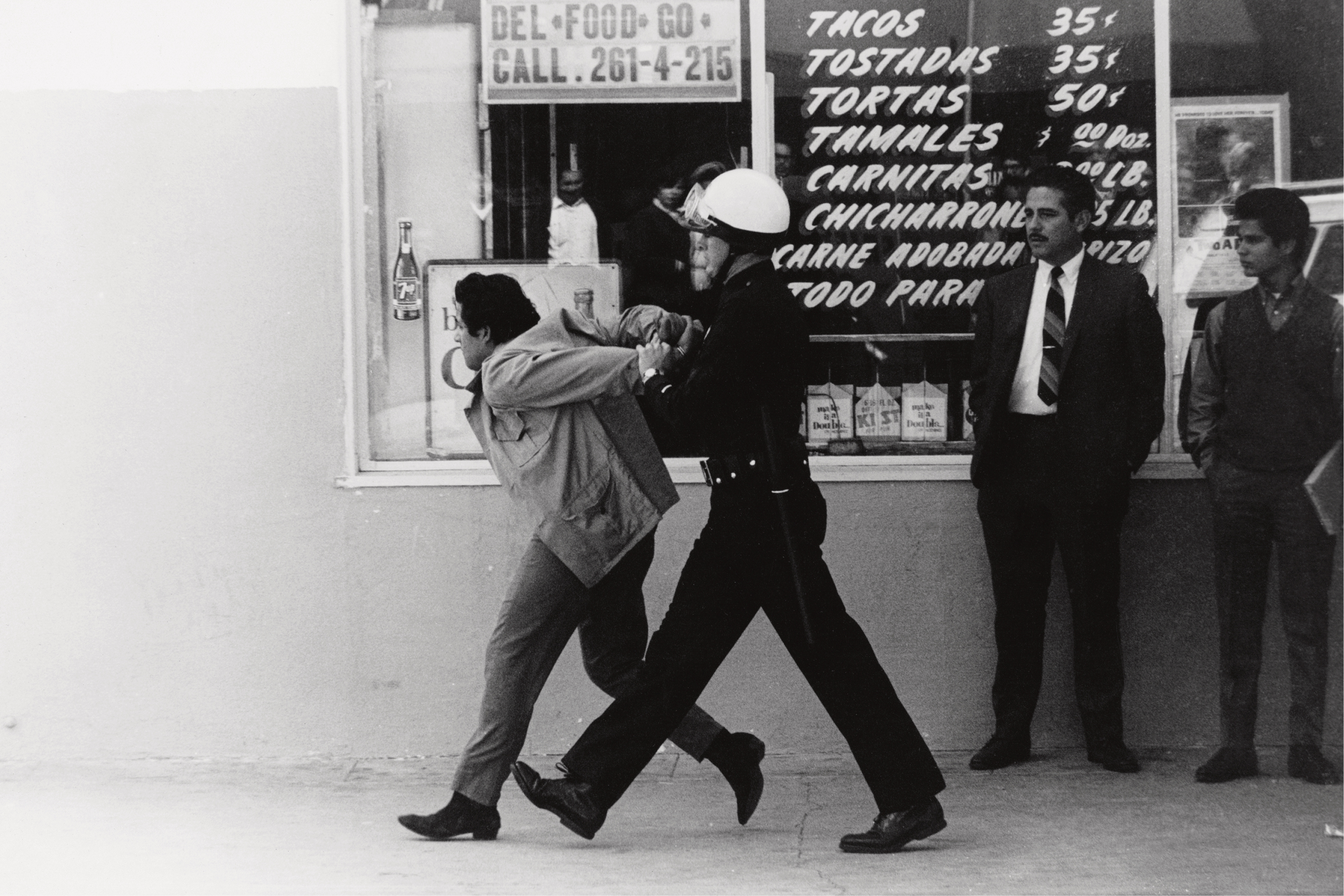 The Chicanx photographer George Rodriguez (b. 1937) played a central role in documenting the civil rights movement in his native Los Angeles. Once a Hollywood celebrity photographer, Rodriguez eventually gravitated to the city’s east side, where he photographed the 1968 high school walkouts as well as the 1970 Chicano Moratorium. This massive demonstration against the draft and the Vietnam War ended in violence, as heavy-handed police tactics resulted in numerous injuries and arrests, as well as the killing of four persons including Rubén Salazar, a prominent journalist and columnist for the Los Angeles Times.