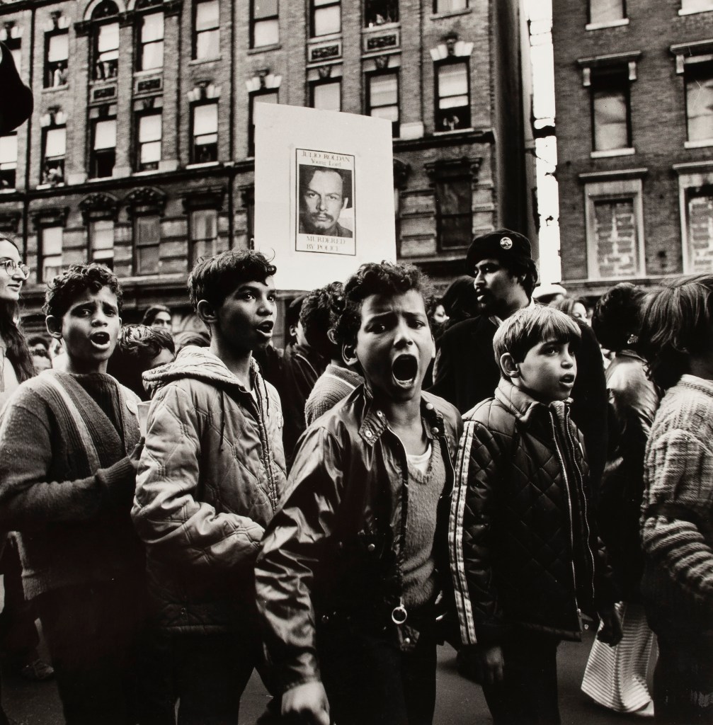 I was struck by the similar expressions of defiance in this and the final photograph, made within a year of each other in Los Angeles and New York. Hiram Maristany (b. 1945), born and raised in East Harlem, was the official photographer of the activist political party the Young Lords. He documented their demonstrations, rallies, working meetings, and the activities they carried out to improve access to education, healthcare, and better housing in their community. Here, Maristany captured the fervent expressions of young people taking part in the funeral of Julio Roldán, a member of the Young Lords who was arrested on trumped up charges and found hanging in his cell the following day. A victim of police brutality, Roldán became a martyr in the eyes of Puerto Rican nationalists.